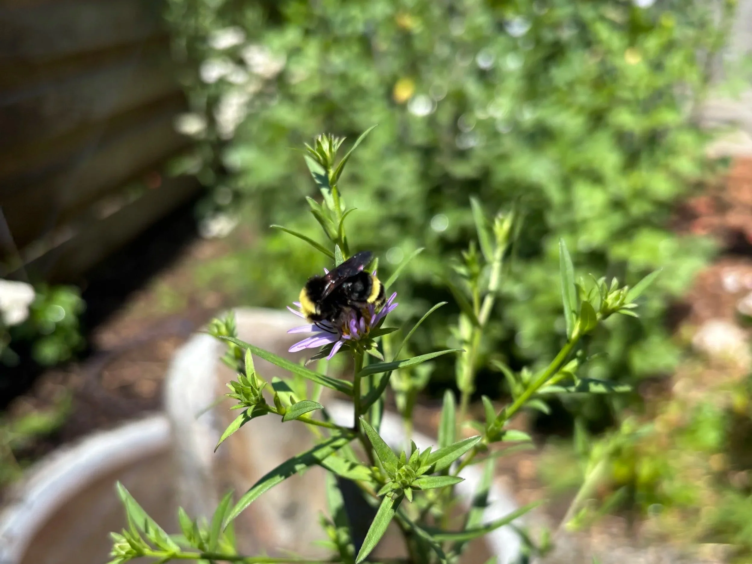 Additionally, native plants support the animals that co-evolved with them. Entomologist and ecologist Dr. Doug Tallamy has written numerous books about this relationship. Check out the link to his books on my Resources Page or explore his website (linked below) if you want to learn more about the science of native plants' role in the ecosystem. Put simply, native plants support the insects that underpin the entire ecosystem. Insects pollinate the majority of plants (like the food we eat), decompose plant and animals to manage waste, and serve as a food source for many animals. We need insects for our survival. Native plants help us support insects, ensuring they can continue doing the heavy lifting for our environment. Bee on Native Douglas Aster