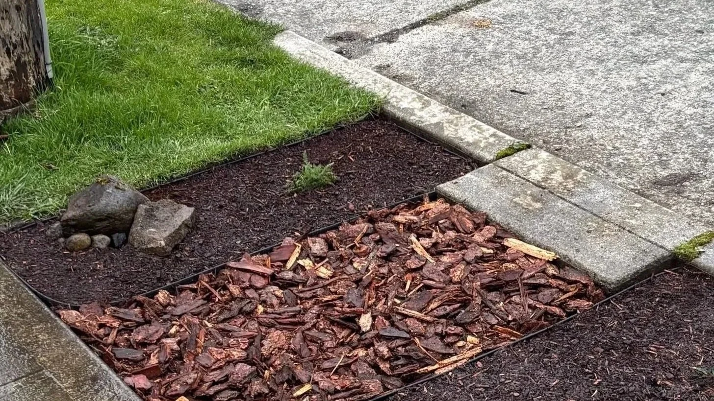 Clearing the sod proved to be the most challenging part of this renovation. Once that was done, the rest of the project followed quickly. At the southern end of the hellstrip, I installed a small bed with a native yarrow (Achillea millefolium) and a “sacrificial rock.” I learned about this concept from a presentation by Erin Berkyto (@theknottygarden) at the 2025 Northwest Flower and Garden Show. She recommended including a designated peeing post or rock in garden designs to keep dogs from peeing on and killing plants. These rocks are too small, but I figured something was better than nothing. I hope to source tall basalt columns in the future to serve double duty as the pee rock and as a water puddler for pollinators.